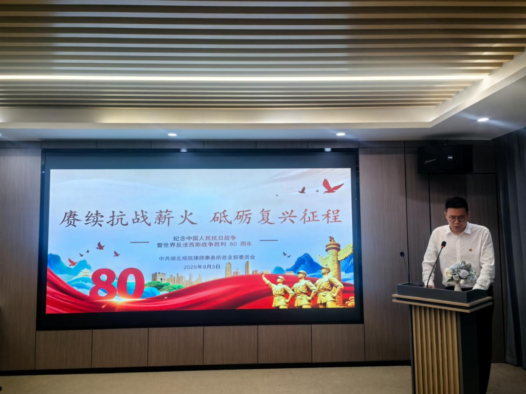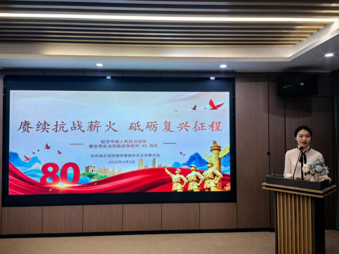 2025年9月3日,中国人民抗日战争暨世界反法西斯战争胜利80周年纪念日,中共湖北观筑律师事务所总支部委员会组织全体同事集中观看盛大阅兵式,共同见证这一历史性时刻。2025年9月3日上午8时50分,在观筑党总支宣传委员万寿律师的主持下,党员律师们洁白衬衫上佩戴的党徽格外醒目。党建指导员章美秋主任也前来与全所同事一同观看阅兵盛况,共同缅怀革命先烈,感受祖国的强大与繁荣。八十年回响:从历史烽火到时代荣光