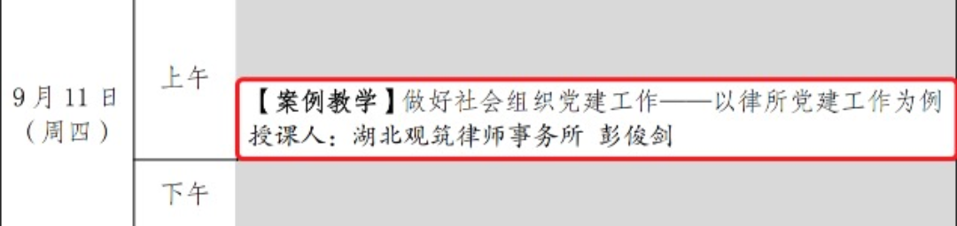 2025年9月8日至12日,中共武汉市江汉区委社会工作部主办的“全区新兴领域党组织书记和党建指导员示范培训班”在区委党校举行。我所党总支书记彭俊剑律师荣幸受邀为江汉区党建指导员及新兴领域党组织书记代表共计八十余人进行了案例教学分享。
